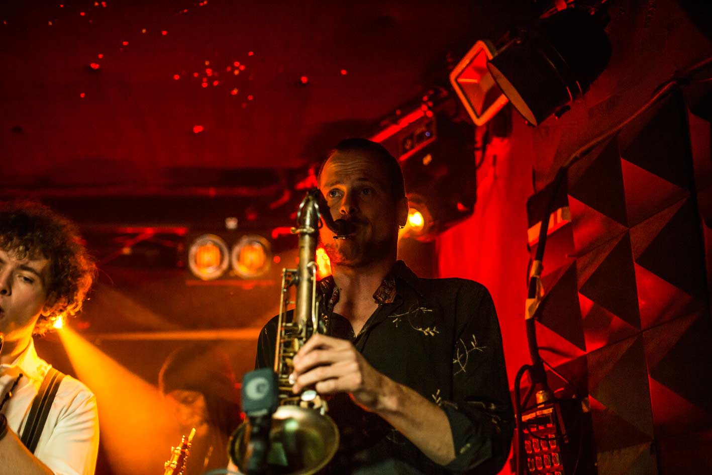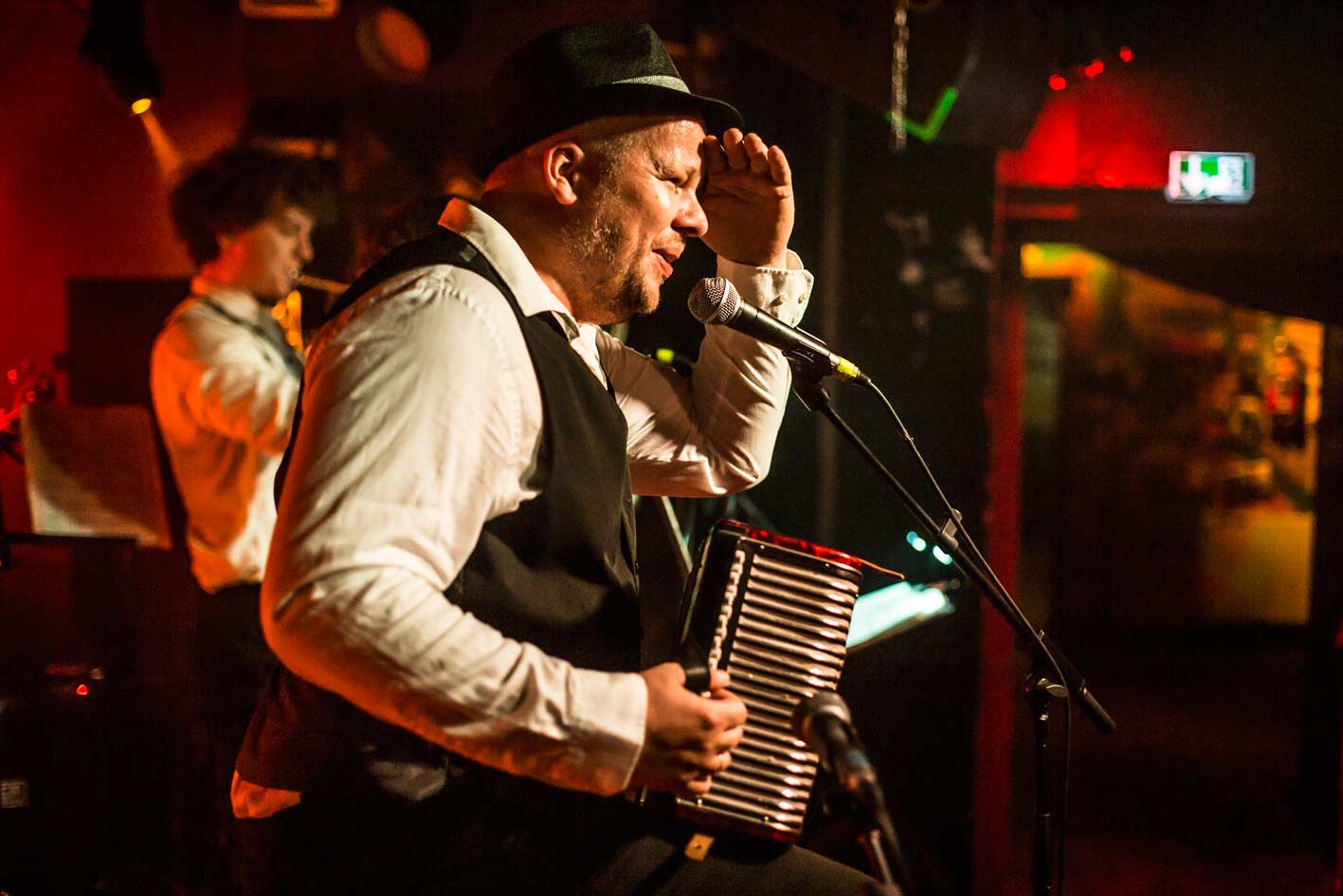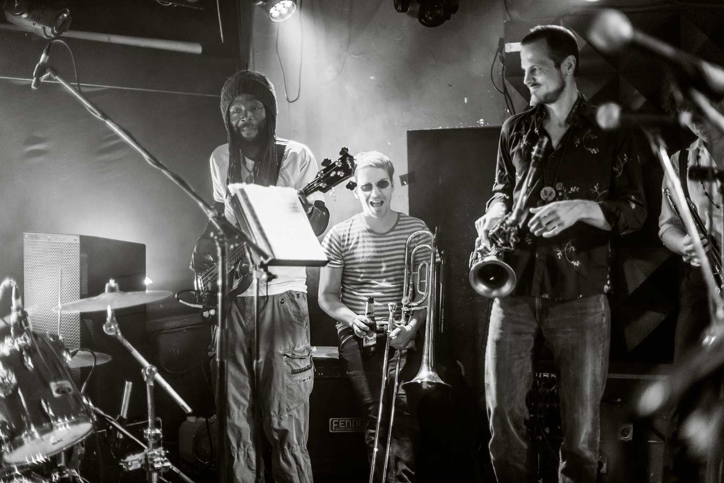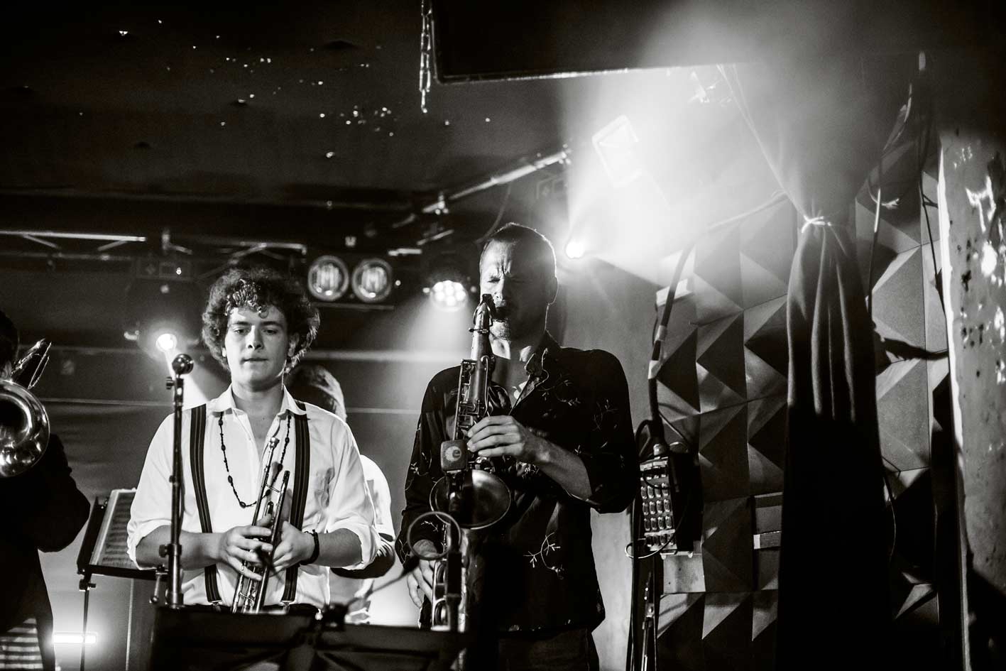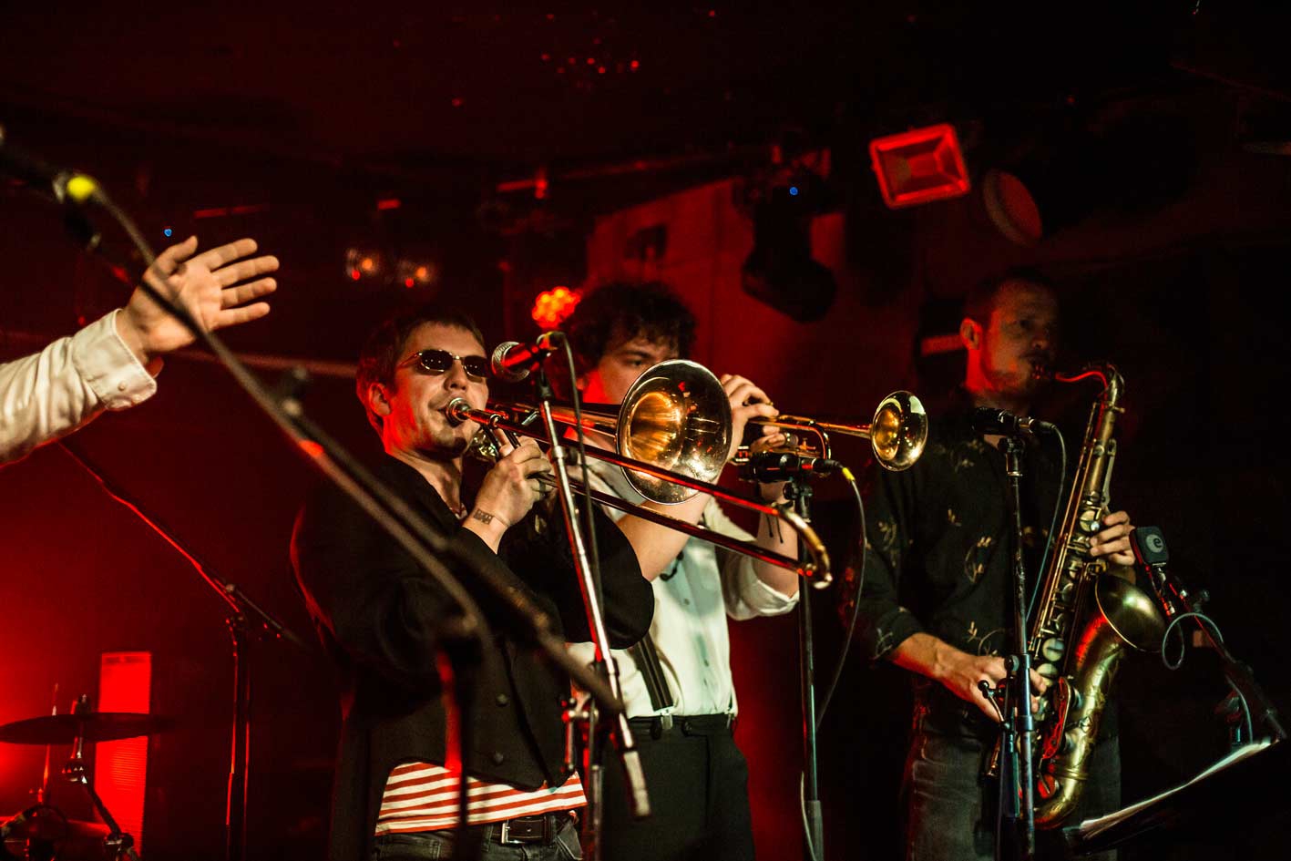 …spielt kraftvollen Balkan-Ska, urbane Polka, Klezmerjazz und Reggae mit ungehobelter Manier. Die Bläsersection ist verwegen jazzy, bewegt sich zwischen Improvisation und klassischen Themen. Die punkige Energie ist unerbittlich, dreist bis frech und setzt jedes Publikum in wilde Bewegung.